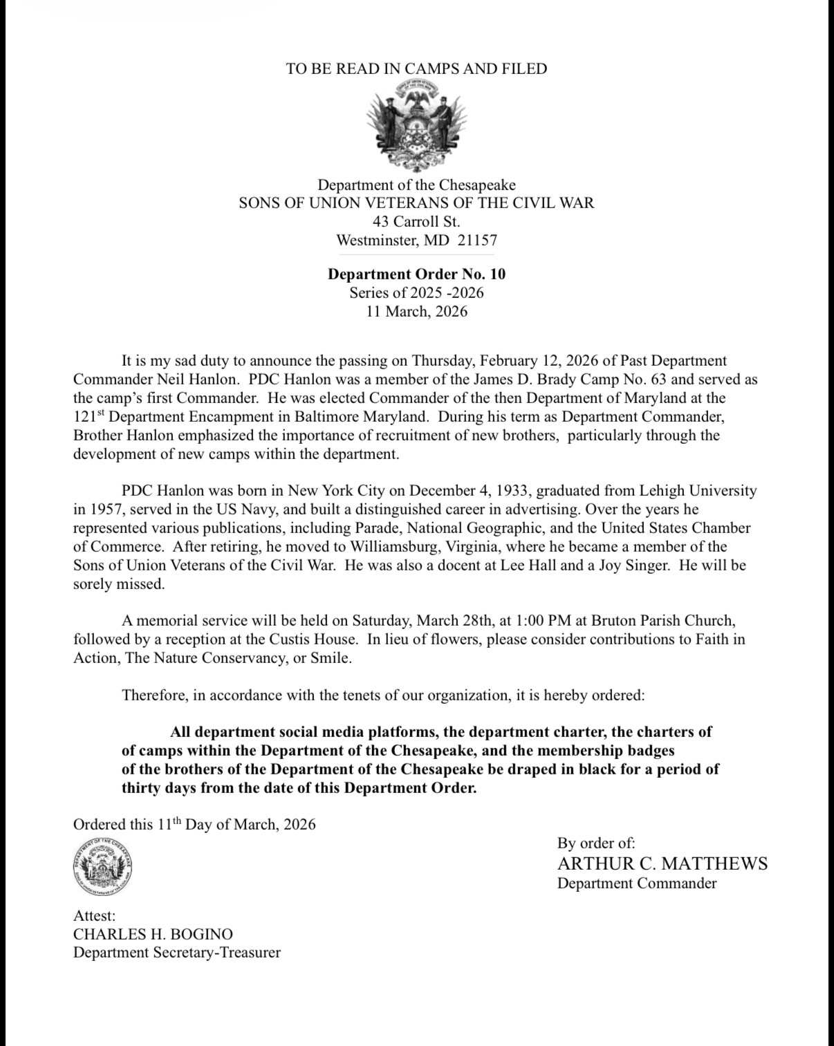The 145th National Encampment of the Sons of Union Veterans of the Civil War and the Allied Orders will be held in Gettysburg, PA. This is open to all members.