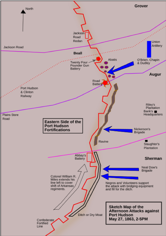 On the morning of May 27, 1863, under Maj. Gen. Banks, the Union army launched ferocious assaults against the lengthy Confederate fortifications. Among the attackers were two regiments of African-American soldiers, the 1st and 3rd Louisiana Native Guards. The attacks were uncoordinated, and the defenders easily turned them back causing heavy Northern casualties. Andre Cailloux, a free man of color from New Orleans and the Captain of the 1st Louisiana Native Guard, Company E, died heroically in this first assault. His death became a rallying cry for the recruitment of African American soldiers. Union generals Thomas W. Sherman and Neal Dow were both seriously wounded and Col. Edward P. Chapin was killed in this attack.